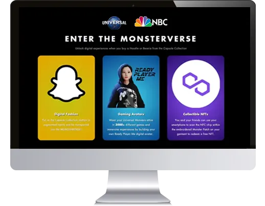 Universal Monsters is a website selling special monster apparel that infuses NFTs with clothing. They embed special NFC chips in their hoodies and beanies that can be scanned to access the hidden NFT. The full suite of features of the store is designed using advanced tech stacks like Ethereum, Nodejs and Metamask.